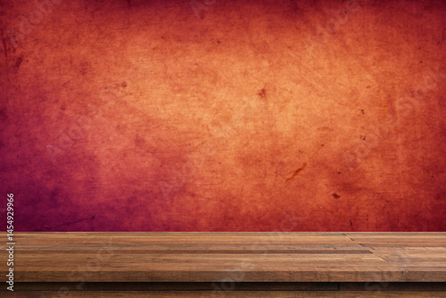Empty wood table at foreground with brown or red color fabric wallpaper at background for product placement displayed. empty brown wooden deck table with red background for luxury concept.