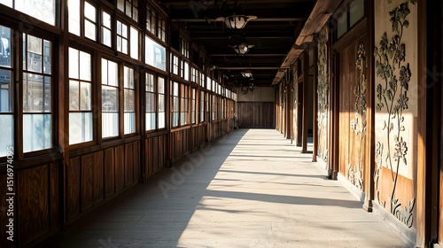 Empty Wooden Hallway With Sunlight And Old Windows