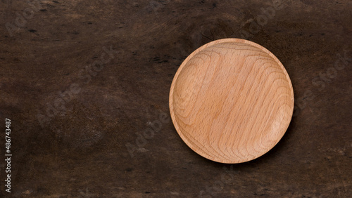 empty wooden plate on a dark wood surface, food or product photography background or backdrop, top view with copy space