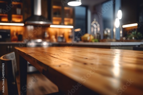 Empty wooden table in a modern kitchen kitchen, cafe or restaurant. Blurred background. Ai generated.