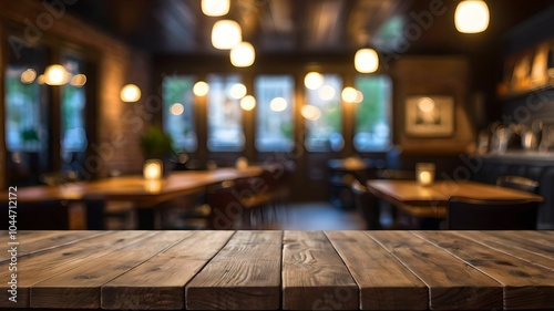 Empty wooden table in focus with a blurred coffee shop setting in the background.