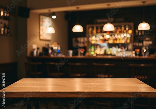 Empty wooden table in front of blurred pub bar background, nightlife, restaurant, interior design concept.