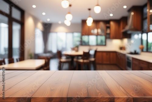 Empty wooden tables for display and chairs create a modern restaurant interior with a luxurious feel