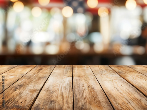 Empty wooden tabletop with blurred restaurant background, ideal for product placement