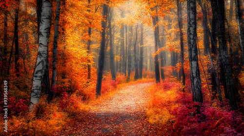 Enchanted Autumn Forest Path: Vibrant Trees in Shades of Orange and Red with Colorful Carpet of Leaves