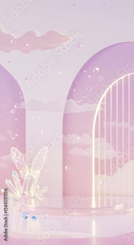 display, dais, pastel, archway, crystal, butterfly, aethereal, graphic, visual, serene, magical, gentle, sparkle, dreamy, stage, aesthetic, fairy tale, feminine, promotion, shine, minimal, relaxing, peaceful, presentation, gradient, glowing, tranquil, atmosphere, mood, fantasy, transparent, soft, product, setting, contemporary, romantic, delicate, purple, artistic, graphic, subtile, racked, shelf, calm, platform, rose, elegant, image