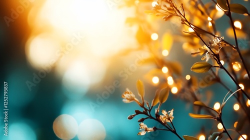 blossom, light, branch, flower, evening, nature, spring, warm, gold, glowing, illuminated, twinkling, fairy, magic, serene, peaceful, tranquil, calm, soft, gentle, romantic, dreamy, beautiful, flora, botanical, plant, light, dark, teal, blue, yellow, orange, background, artistic, aesthetic, photo, image, picture, scene, view