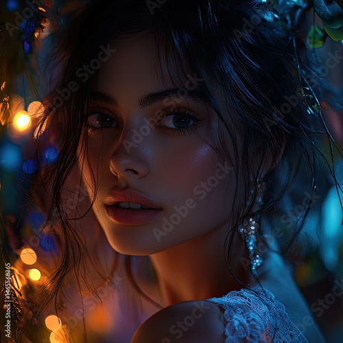 woman, girl, portrait, beauty, model, fashion, glamour, elegant, attractive, stylish, beautiful, pretty, gorgeous, charming, eye, lip, hair, make-up, jewellery, accessory, floral, light, glowing, night, dark, blue, orange, yellow, sparkle, light, bokeh, fantasy, dreamy, enchanting, forest, nature, evening, dress, lace, romantic, captivating, intriguing, portraiture, art, digital, glamourous, soft
