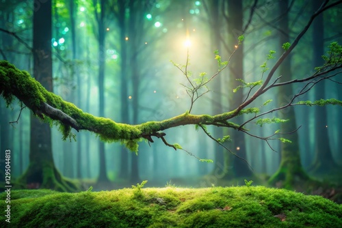 Enchanted Forest Mossy Branch with New Growth, Sunlight Filtering Through Ancient Trees