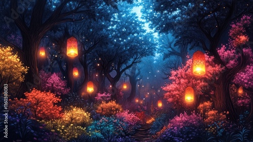 forest, path, night, magical, fantasy, lantern, tree, flower, colourful, vibrant, glowing, illuminated, dark, mysterious, enchanting, whimsical, dreamlike, surreal, artwork, digital, painting, art, illustration, nature, scene, ambience, peaceful, serenity, beauty, wonder
