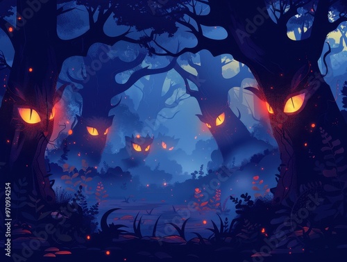 Enchanted forest with glowing eyes and shadows, spooky atmosphere,