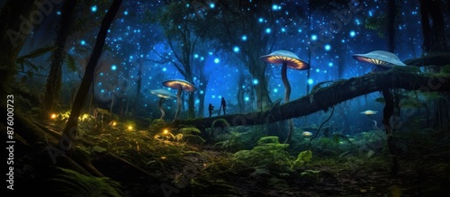 forest, enchanted, glowing, mushroom, night, dark, magical, fantasy, dreamlike, surreal, blue, green, yellow, tree, leaf, branch, moss, light, atmosphere, mysterious, nature, wood, bright, luminescent, whimsical, fairy tale, enchanting, mystical, sparkling