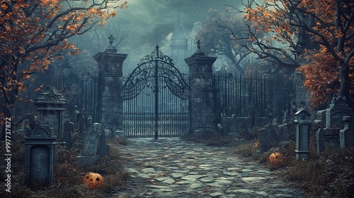 halloween, cemetery, gate, haunted, whimsical, elegant, luxury, old, decrepit, skittish, ultra, hd, animation, cartoon, playful, anime, style, masterpiece, house, mystical, enchanted, fantasy, ghostly, atmosphere, ambience