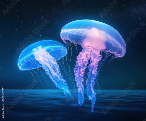 surreal, night, sky, giant, jellyfish, aglow, star, aethereal, ocean, glow, enchanting, floating, magical, marin, life, celestial, dreamy, calm, serene, whimsical, astronomy, nebula, cosmic, underwater, creature, biology, lighting, fantasy, scape, calmness