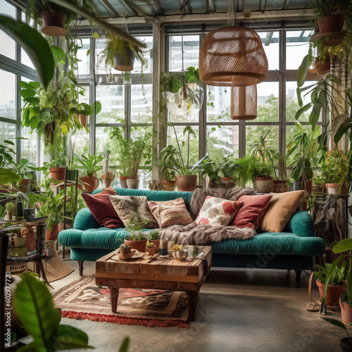 Enchanted Oasis: AI-Generated Urban Indoor Greenhouses with Boho Bliss