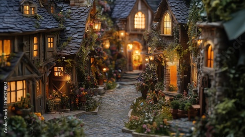 Enchanted Village: A whimsical miniature village, a miniature diorama, with cobblestone streets, quaint houses, and glowing lanterns, creates a sense of wonder and magic. The intricate details.