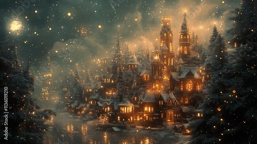 snow, winter, night, town, village, christmas, light, castle, building, house, architecture, holiday, season, magic, fantasy, fairy tale, enchanted, dreamlike, whimsical, cosy, romantic, scenic, beautiful, charming, picturesque, serene, peaceful, calm, tranquil, dark, gold, warm, glowing, sparkling, river, water, tree, forest, snowflake, star, sky, moon, atmosphere, illustration, artwork, painting, graphic, design