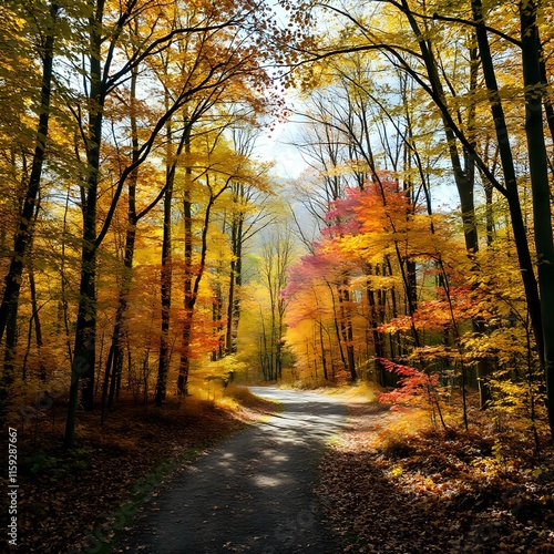 autumn, forest, fall, trail, nature, photo, scene, tranquil, gold, path, colours, red, leaf, orange, yellow, walk, hike, clear, blue, sky, sunny, day, vibrant, foliage, dappled, sunlight, canopy, minimalist, style, high-quality, stock, photo, adobe, photograph, beauty, changing, season