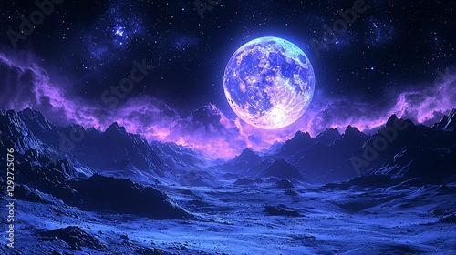 moon, night, sky, star, mountain, landscape, blue, purple, snow, cold, fantasy, alien, mystical, magical, cosmic, nebula, space, serene, tranquil, peaceful, dark, vibrant, colourful, glow, light, aethereal, dreamlike, majestic, huge, winter, scene, art, digital, illustration, background, texture, beauty, nature, power, wonder, mystery, silence, energy