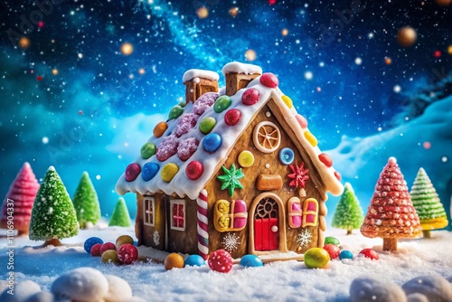 Enchanting Cartoon Gingerbread House Adorned with Colorful Candy and Icing, Nestled in a Winter Wonderland of Soft, White Snowflakes and Festive Holiday Cheer
