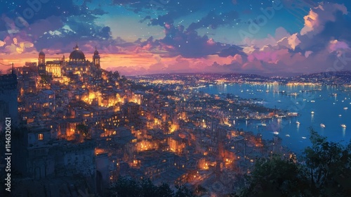 sunset, city landscape, coastal, city, night, ocean, building, architecture, light, twilight, star, sky, cloud, water, boat, ship, horizon, view, panorama, seascape, illustration, artwork, painting, fantasy, magical, dreamlike, romantic, serene, peaceful, calm, beautiful, vibrant, colours, warm, cool, tone, evening, night time, travel, destination, landscape, scenery, urban, mediterranean, europa, historic