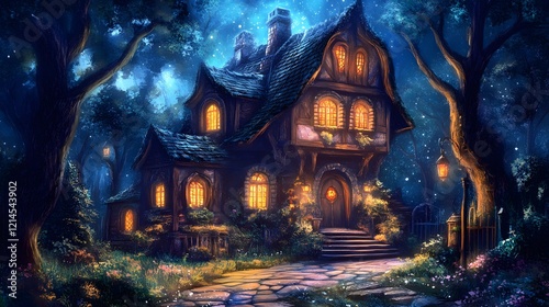 nature, art, doorway, cosy, glowing, quiet, home, building, tree, architecture, calmness, night, old, peaceful, whimsical, step, star, moonlit, scene, dark, garden, digital, fairy tale, relaxing, romantic, scenery, flower, artwork, evening, mysterious, stone, fence, warm, house, painting, gothic, landscape, lantern, magic, calm, window, sparkle, serene, forest, light, fantasy, magical, path