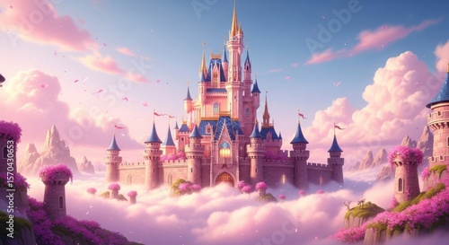 Enchanting Fairytale Castle Amidst Clouds and Blossoms