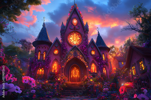 Enchanting fairytale castle at sunset, surrounded by vibrant flowers and glowing windows. A magical scene perfect for fantasy or whimsical designs.