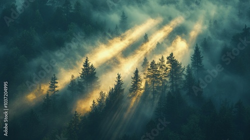 Enchanting Fog in a Forest with Sunlight Beams and Golden Mist