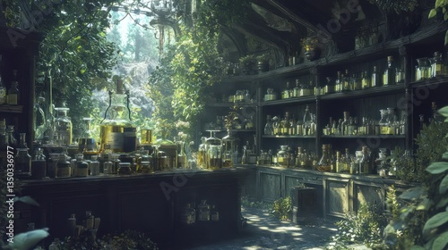apothecary, forest, herb, sunlight, bottle, magical, mystical, alchemy, nature, plant, wood, greenery, jar, laboratory, vintage, rustic, old, wooden, shelf, counter, dark, shadow, mysterious, fantasy, elixir, remedy, healing, medicine, wild, organic, natural, green, brown, light, glasses, ancient, science, research, magician, sorcerer, hidden, secret, mystery, discovery