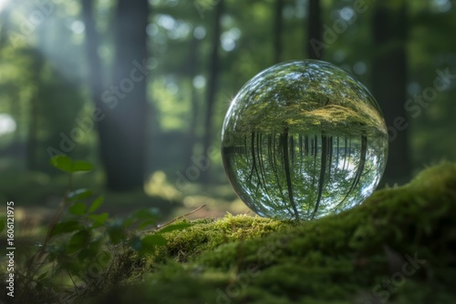 Enchanting Forest Landscape Reflected in a Crystal Ball Resting on Moss Covered Ground Creating a Surreal Scene