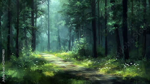 nature, art, environment, foliage, greenery, hike, tree, calmness, sunlight, plant, peaceful, dense, digital, fairy tale, summer, timberland, green, scenery, wood, pathway, lush, exploration, deep, artwork, trail, painting, spring, sunbeam, walk, landscape, journey, calm, adventure, serene, forest, magical, flora, path, enchanted, illustration, mystical