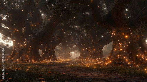 enchanted forest, light, fairy tale, mystical, magical, mysterious, night, dark, tree, tunnel, path, pathway, wood, forest, nature, landscape, fantasy, glowing, illuminated, warm light, golden light, dreamlike, serene