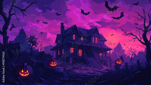 Enchanting Halloween Night: Purple Haunted House with Spooky Jack o’ Lantern and Flying Bats
