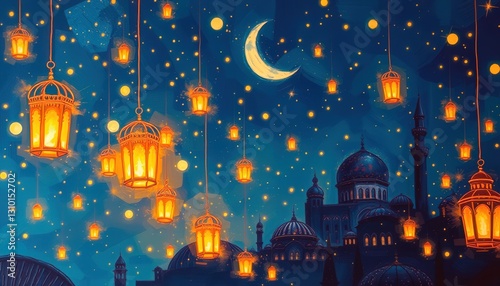 Enchanting night sky adorned with glowing lanterns over a historic mosque under a crescent moon