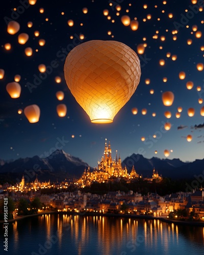 lantern, night, sky, festival, celebration, light, glow, air, hot, balloon, water, landscape, charme, beauty, mountain, cloud, magical, serene, adventure, travel, scenery, dusk, warm, illumination, romantic, fairy, whimsical, dream, atmospheric, view, holiday, tradition, elegance, horizon, tranquil, enchanting, peaceful, twilight, nature, summer, picturesque, culture, ambience, hot air balloon, illustration, vector, fly