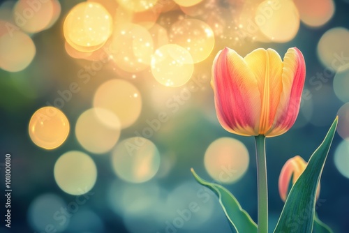 enchanting, solitary, tulip, magical, light, bokeh, background, flower, nature, bloom, spring, flora, garden, beauty, delicate, vibrant, colourful, yellow, red, sunshine, sunlight, bright, dreamy, fantasy, peaceful, serene, fresh, growth, elegance, single, green, leaf, plant, botanical, radiant, shimmer, glowing, aethereal, calmness, soft, illuminated, ornamental