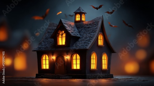 Enchanting Spooky House: An intricately detailed small house glows warmly against a haunting twilight backdrop, evoking a sense of mystery and eerie charm, as bats take flight above.