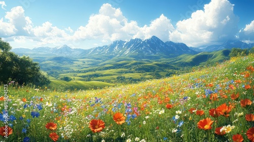 enchanting spring meadow vibrant wildflowers in foreground rolling green hills cerulean sky with wispy clouds sunlit pastoral scene