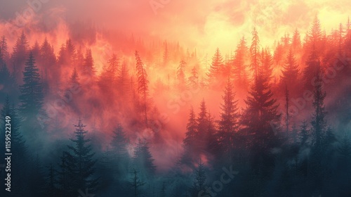 Enchanting Sunrise Foggy Forest Misty Pines Red Sky Nature Landscape