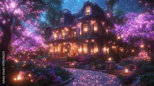 luxury home, victorian, house, home, night, illuminated, light, lamp, garden, flower, tree, purple, pink, glowing, magical, enchanting, dreamy, fantasy, fairy tale, romantic, elegant, beautiful, architecture, building, estate, landscaping, pathway, paseo, star, sky, dark, scene, vibrant, colourful, ornate, detail, exterior, night time, serene, peaceful, whimsical, mysterious, sparkling, glistering, ambience, atmosphere