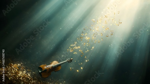 Enchanting Violin Among Sunlit Music Notes in Underwater Scene with Golden Particles