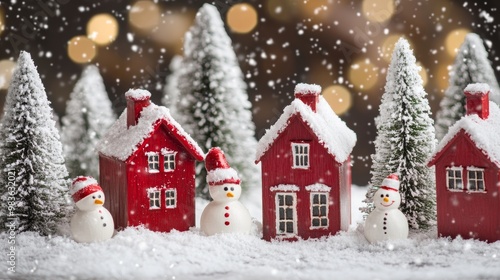 Enchanting winter wonderland festive scene of snowy red houses, snowmen, and snow covered trees