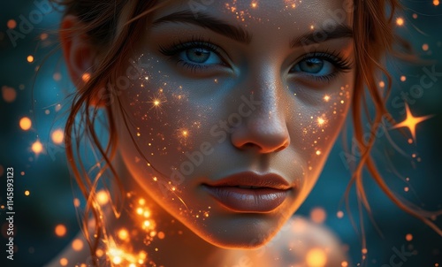 portrait, female, young, beauty, glow, sparkle, magic, dreamy, closeup, blue eye, aethereal, lit, glamourous, soft focus, colourful, artistic, creative, mystical, emotion, charisma, detailed, facial features, youthful, stylish, charming, radiant, alluring, feminine, expressive, vibrant, bokeh, dreamlike, serene, night, glistering, whimsical, artistry, photo, enchanting, radiance, fantasy