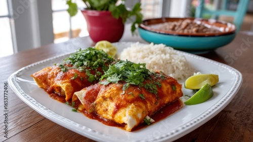 Enchilados on a plate, garnished with fresh cilantro and lime, served with rice and beans, in a bright Mexican interior