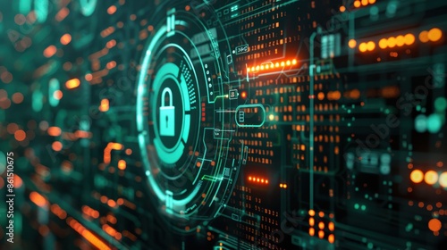 Encrypted data symbol, green firewall interface, digital lock, side view, emphasizes data safety, futuristic tone, vivid color scheme