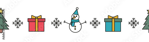 Endless long New Year's Christmas pattern: snowman, Christmas tree, gifts, snowflakes