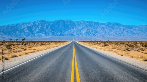 Endless straight road disappearing into the horizon, surrounded by vast open desert and a distant mountain range.