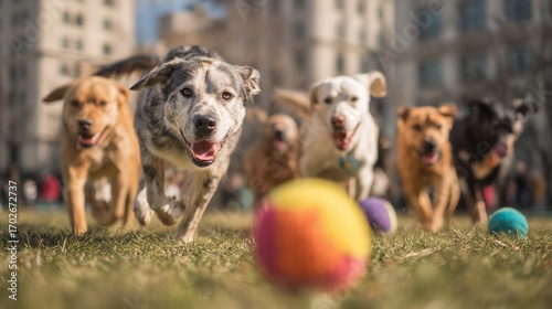 Energetic dogs running towards camera on grassy field with colorful balls in urban park