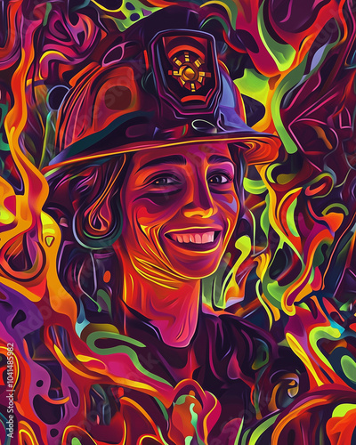 firefighter, energetic, female, joyful, smile, abstract, flames, portrait, colourful, vibrant, mood, action, expression, strength, heroism, atmosphere, art, personality, creativity, engagement, empowerment, identity, rescue, professional, character, lively, design, warmth, powerful, emotion, bold, background, brightness, dynamic, confidence, camaraderie, service, safety, culture, community, passion, determination, adventure, inspiration, representation, closeup, contemporary, beauty, fun